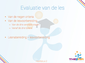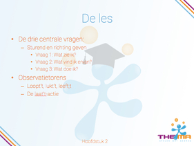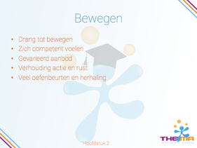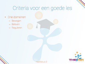 In hoofdstuk 2 komen de negen criteria voor een goede les bewegingsonder- wijs met kleuters aan bod. Deze worden direct gekoppeld aan de lesvoorbe- reiding, de les en de evaluatie van de bewegingsles. Er worden drie verschil- lende invalshoeken om naar de bewegende kleuters te kijken geschetst. De drie observatietorens en de drie centrale vragen, wat zie ik, wat vind ik er- van en wat doe ik?, die je als leerkracht tijdens de les kunt inzetten worden uitgewerkt. Het hoofdstuk wordt afgesloten met de evaluatie. Na afloop van een gegeven les kijk je terug naar hoe de gehele les is verlopen. Wat ging goed, wat mag en kan anders?