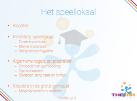 Het volgende bespreken we in hoofdstuk 9; Welke plek neemt het bewegingsonderwijs met kleuters in bij jou op school? Het is de verantwoordelijkheid van de directie om in samenspraak met het team hier vorm en richting aan te geven.