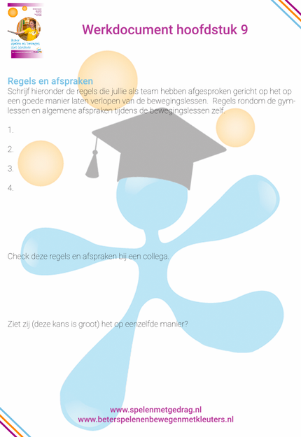 Schrijf in het document hieronder de regels die jullie als team hebben afgesproken gericht op het op een goede manier laten verlopen van de bewegingslessen. Regels rondom de gymlessen en algemene afspraken tijdens de bewegingslessen zelf.