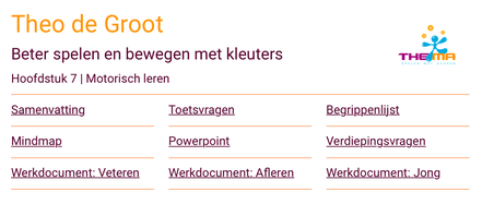 Deze module over motorisch leren heeft een opbouw zoals je hiernaast ziet. Door op een titel van een werkvorm te klikken, bijvoorbeeld samenvatting of mindmap kom je direct bij het